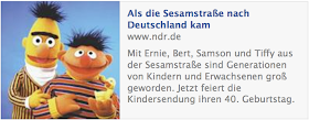 因應今年(2013)是芝麻街在德國播映的第40年,NDR特別推出了紀錄片"Als die Sesamstraße nach Deutschland kam"這部紀錄片,來述說陪著這個世代的小孩,還有已經長大的大小孩的兒童節目歷史。